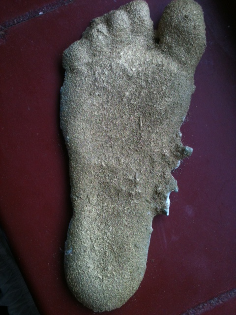 Taking a shallow tray we filled it with dry sand from the sandpit then carefully Boo pressed his foot and a hand into the sand leaving impressions: