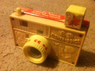 The condition isn’t great, the strap is missing and the paper label from the bottom is torn, but the mechanism works, the pictures can be seen clearly and they are so kitsch! I’ve proudly added it to the growing collection of vintage Fisher Price toys I’ve been collecting! For 50pence it has provided a huge amount of entertainment already!